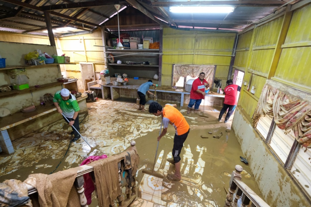 Banjir berserta selut, memerlukan water jet dan kerahan tenaga bagi membersihkan rumah penduduk setempat.