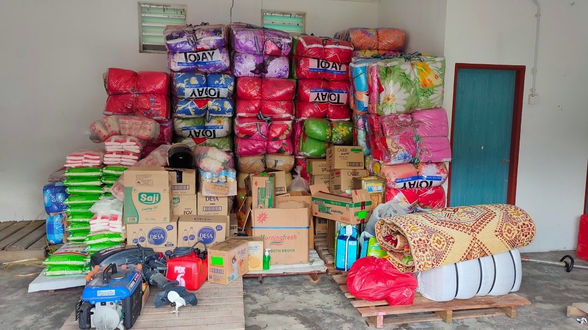 Antara barang keperluan yang diagihkan di pusat pemindahan banjir.